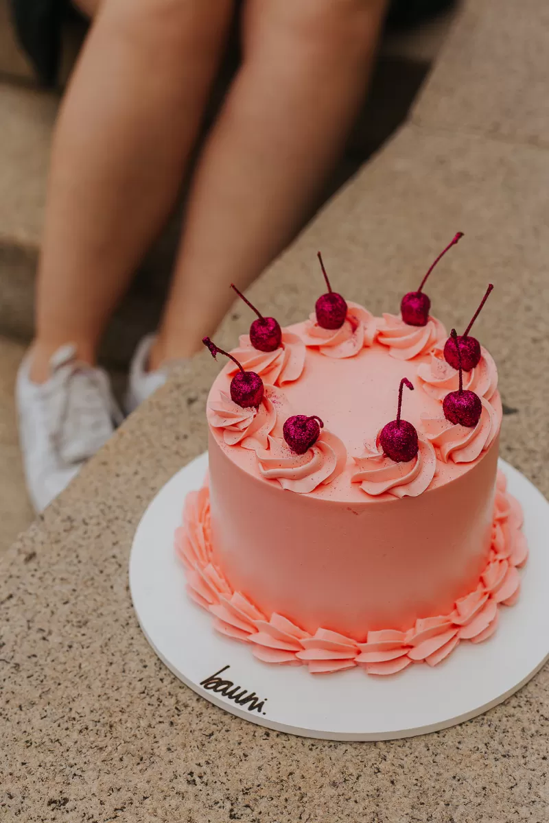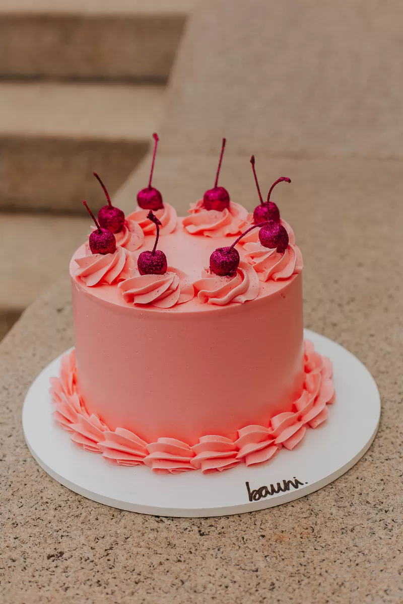 Bolo decorado em buttercream de merengue suíço e finalizado com cerejas. Obs: Caso queira, inserir no campo "observações" a frase do bolo. Peso aproximado de cada tamanho: PP -> 0,9kg P -> 1,6kg M -> 2kg G -> 2,9kg