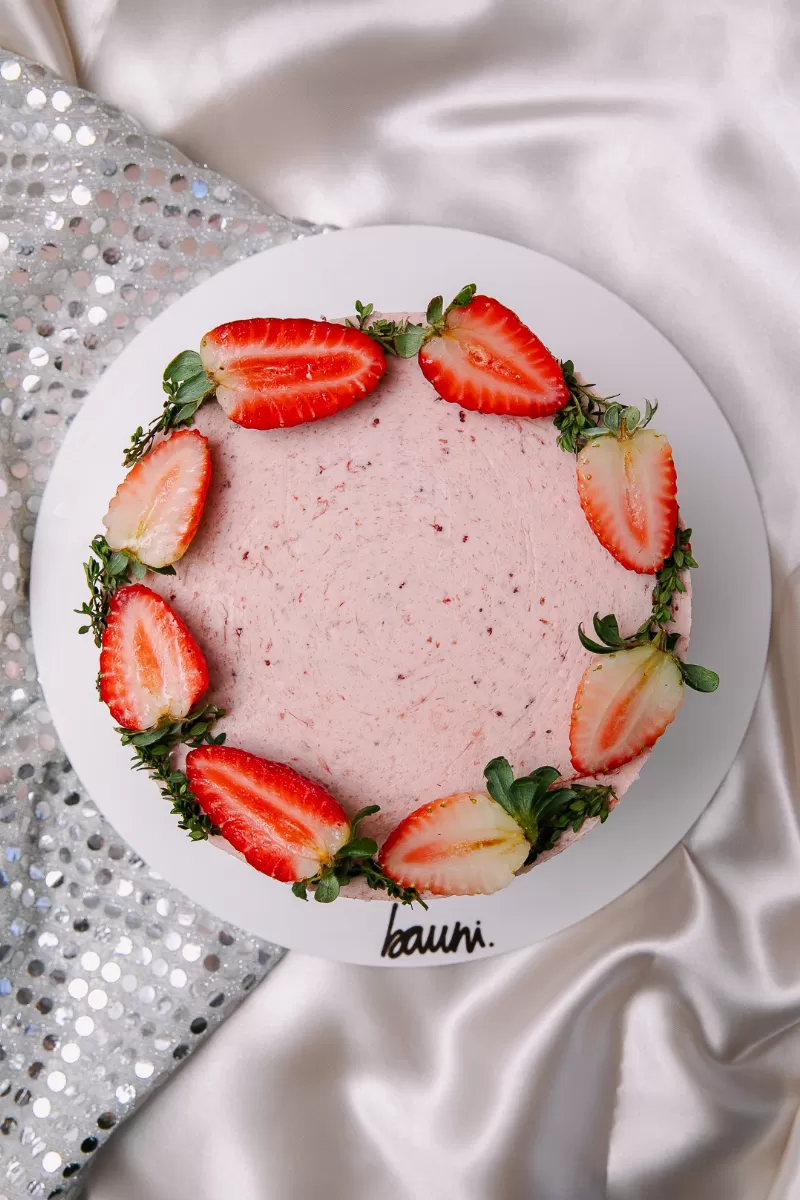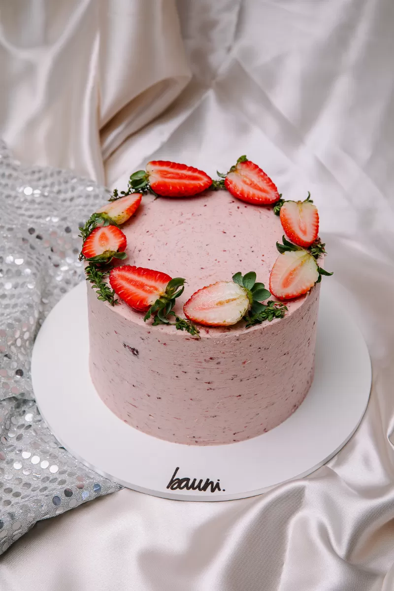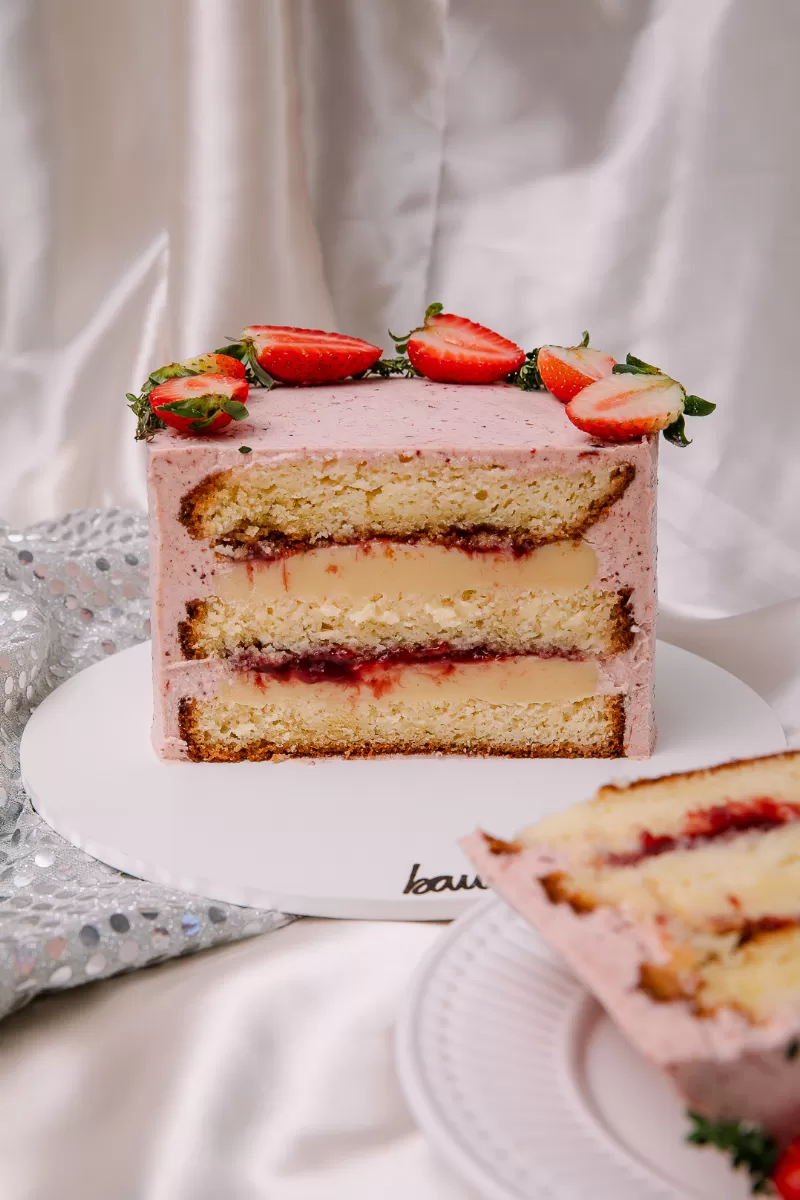 Bolo coberto com buttercream saborizado de redução de morango. Massa de baunilha com brigadeiro de chocolate branco e redução de morango. Peso aproximado de cada tamanho: PP -> 0,9kg P -> 1,6kg M -> 2kg G -> 2,9kg