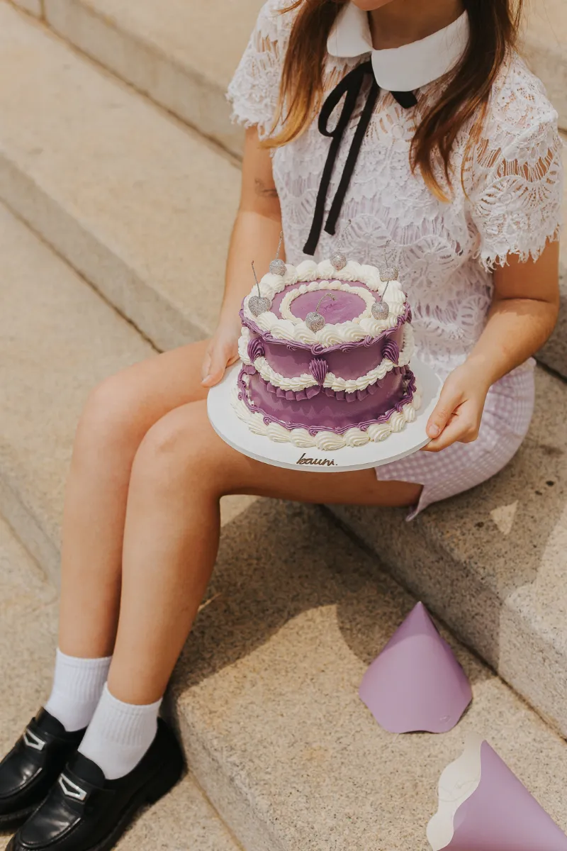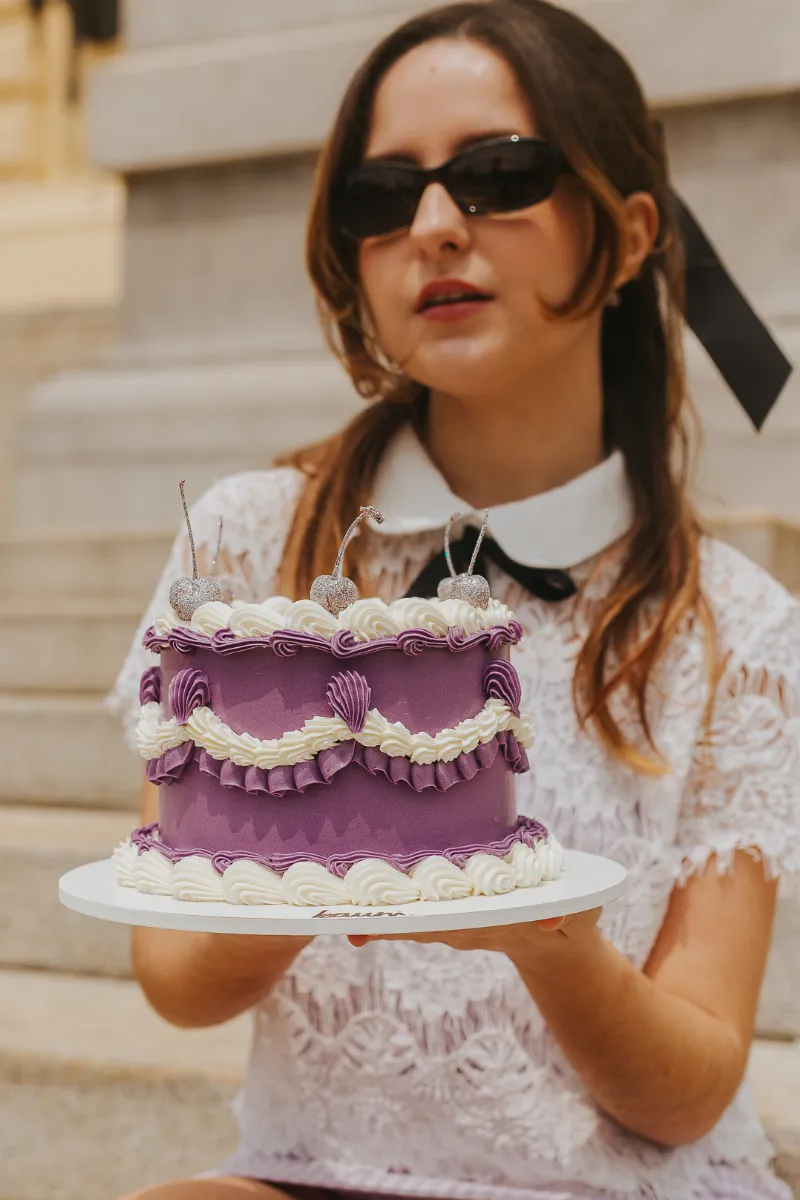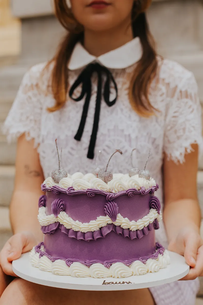 Bolo finalizado em buttercream de merengue suíço, com três camadas de massa e duas de recheio e decoração com cerejas brilhantes. Peso aproximado de cada tamanho: PP -> 0,9kg P -> 1,6kg M -> 2kg G -> 2,9kg