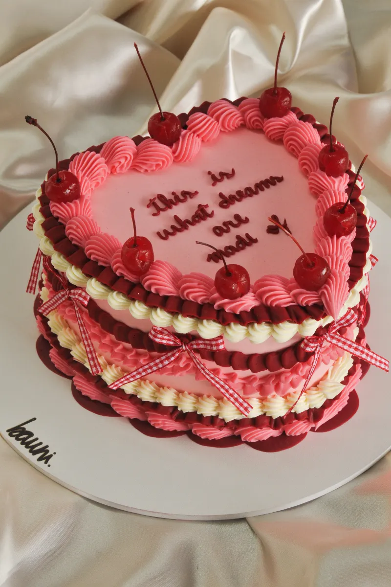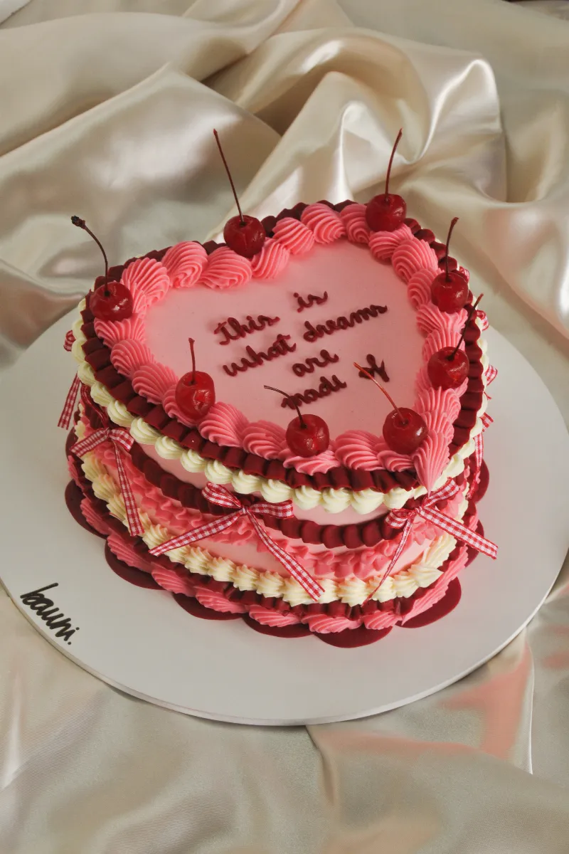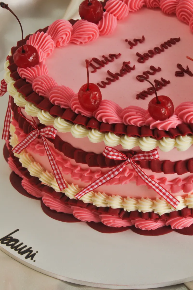 A frase pode ser alterada de acordo com a sua escolha! Escreva no campo "observação". Bolo finalizado em buttercream de merengue suíço, com três camadas de massa e duas de recheio. Decorado com cerejas e lacinho quadriculados. Peso aproximado de cada tamanho: P -> 1,6kg M -> 2kg G -> 2,6kg