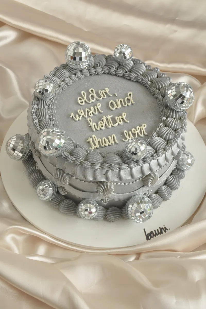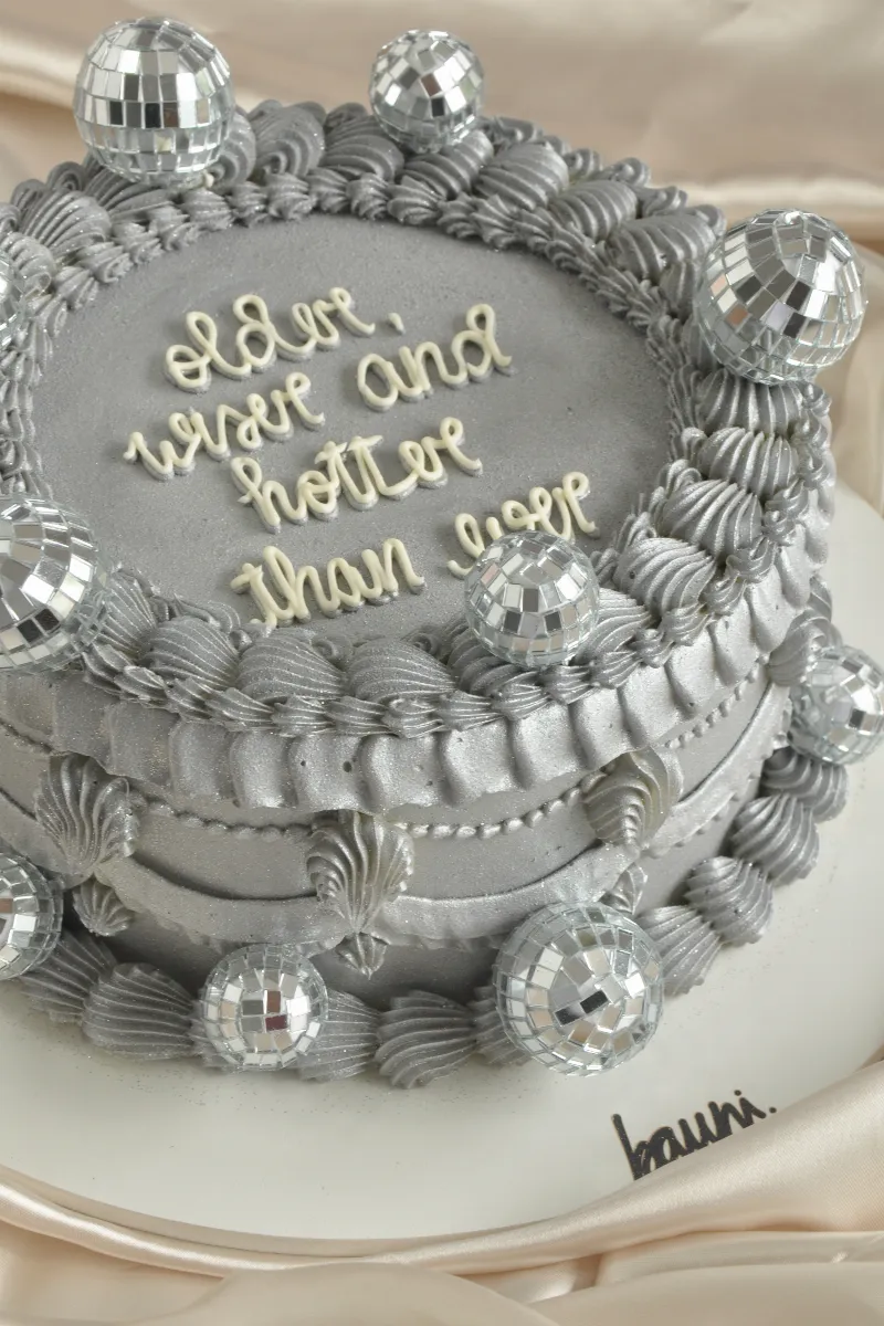 Bolo finalizado em buttercream de merengue suíço, com três camadas de massa e duas de recheio. Decorado com pó e glitter prateados e disco balls. Caso queira adicionar frase, deixar no campo "observação". Peso aproximado de cada tamanho: PP -> 0,9kg P -> 1,6kg M -> 2kg G -> 2,9kg