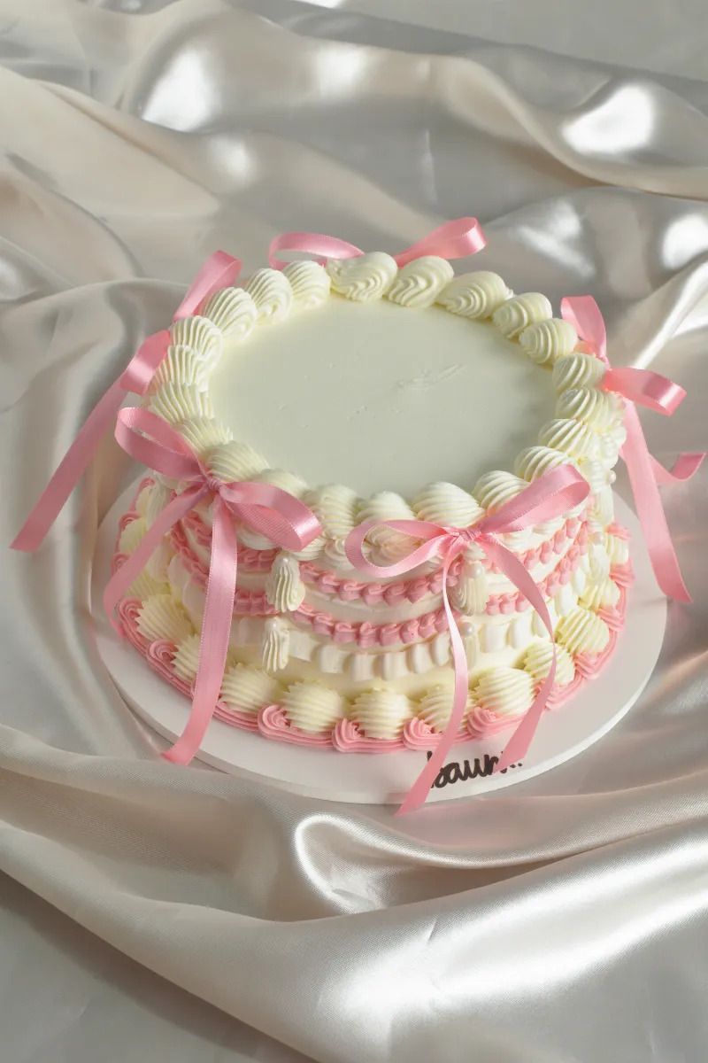 Bolo finalizado em buttercream de merengue suíço, com três camadas de massa e duas de recheio. Decoração inclui laços de cetim e uma frase (deixar nas observações). Peso aproximado de cada tamanho: PP -> 0,9kg P -> 1,6kg M -> 2kg G -> 2,9kg