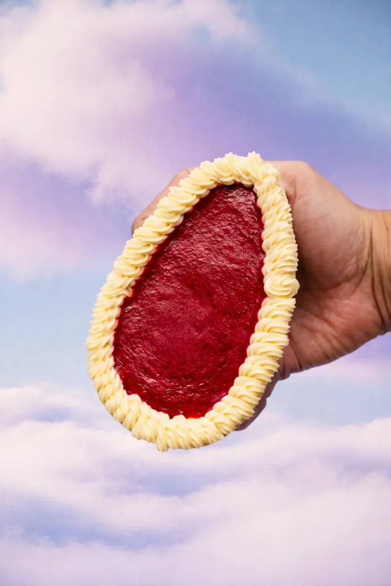 Casca de chocolate branco com base crocante de biscoito, ganache cremosa de cream cheese e gel de morango fresco. "P" pesa 290g. "G" pesa 390g.