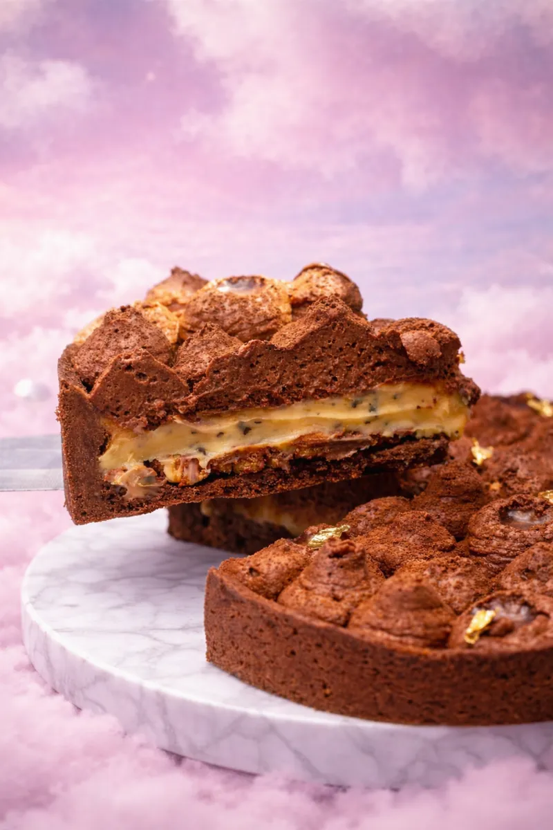Sablé de cacau, crocante de chocolate, ganache de maracujá e mousse de chocolate no topo. Pesa 1,2kg.
