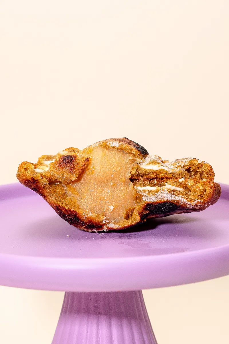 Massa tradicional com um toque de baunilha, gotas de chocolate branco, recheio de brigadeiro brûlée e finalizado com açúcar maçaricado.