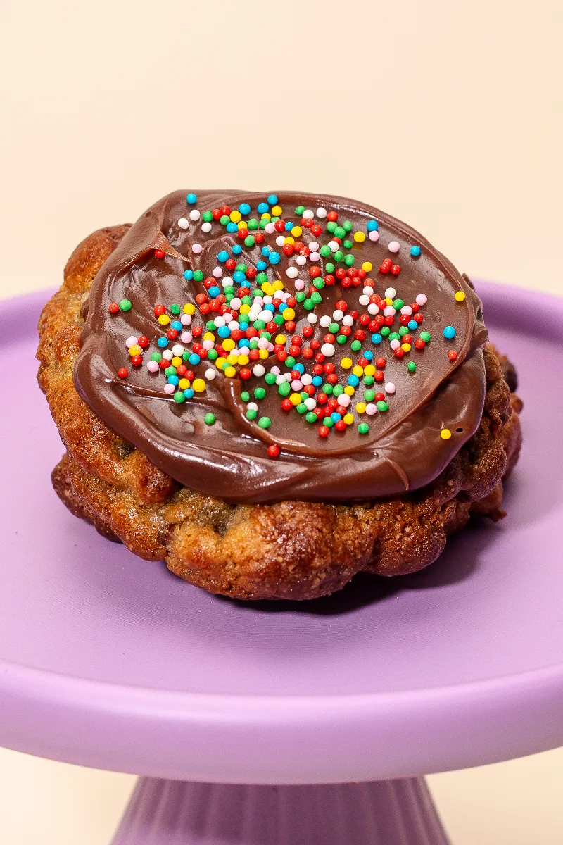 Massa tradicional com toque de baunilha, gotas de chocolate ao leite e cobertura de brigadeiro tradicional com granulado colorido.