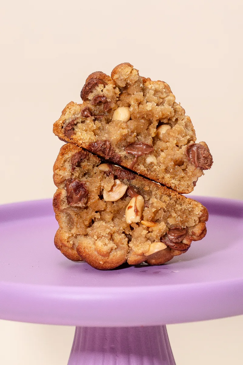 Massa com pasta de amendoim, chocolate meio amargo e amendoins inteiros.