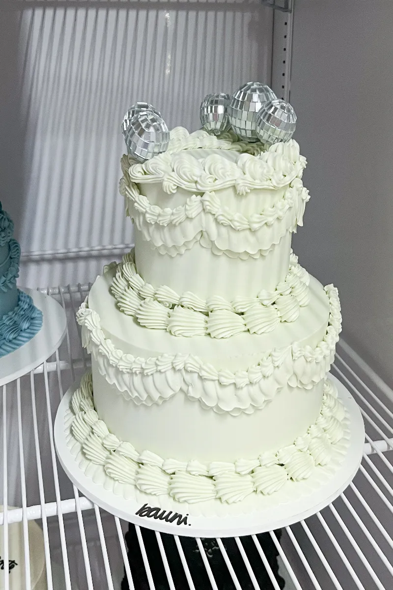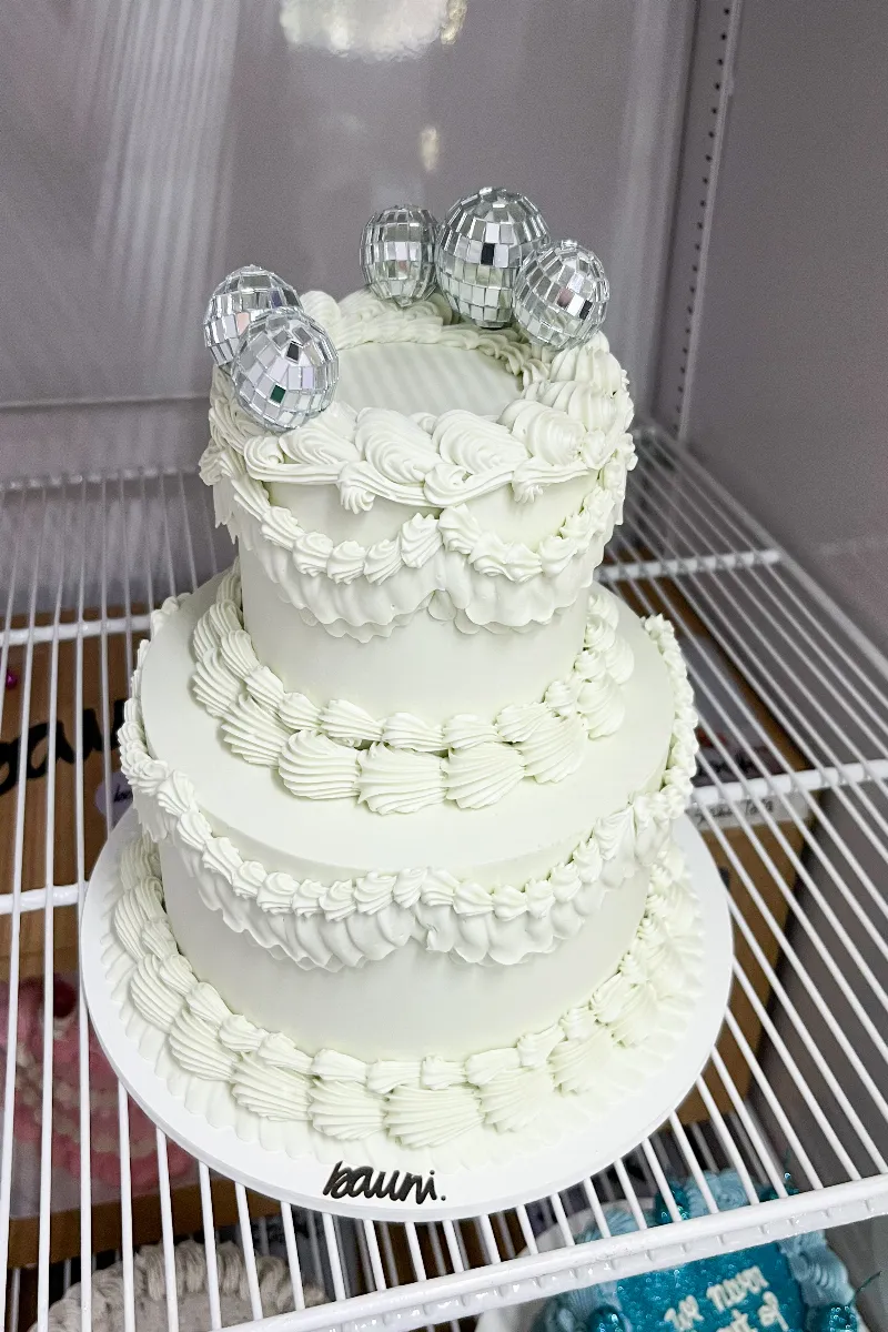 Bolo DE DOIS ANDARES, decorado em buttercream de merengue suíço e finalizado com disco balls. Obs: Caso deseje, inserir no campo "observações" a frase do bolo, ou informar caso não queira nada escrito. Peso aproximado: 2A -> 3kg; 2APLUS -> 4,5kg