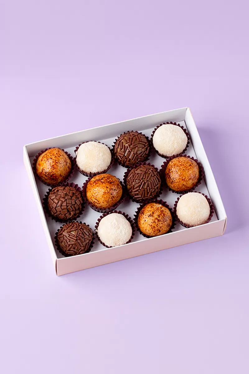 Caixa com 12 brigadeiros Obs: Escolher até 2 sabores.