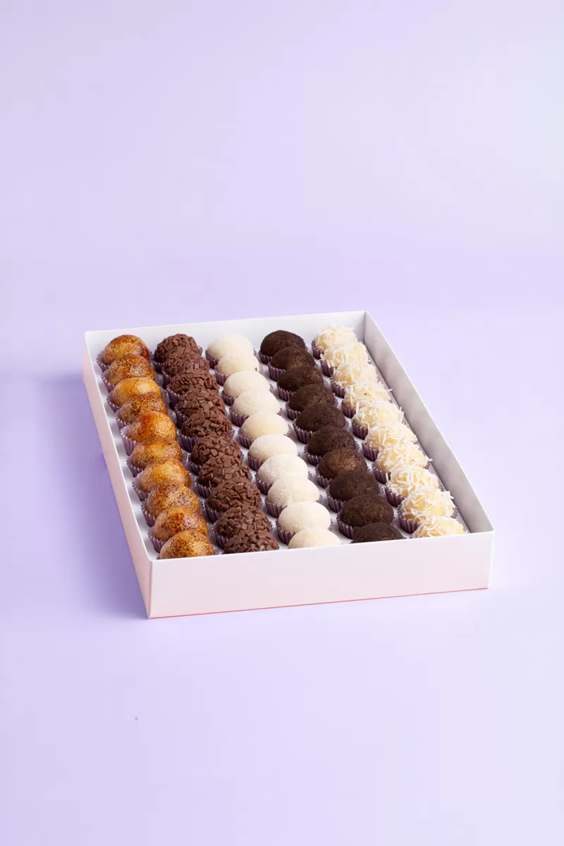 Caixa com 50 brigadeiros. Obs: Escolher até 3 sabores.