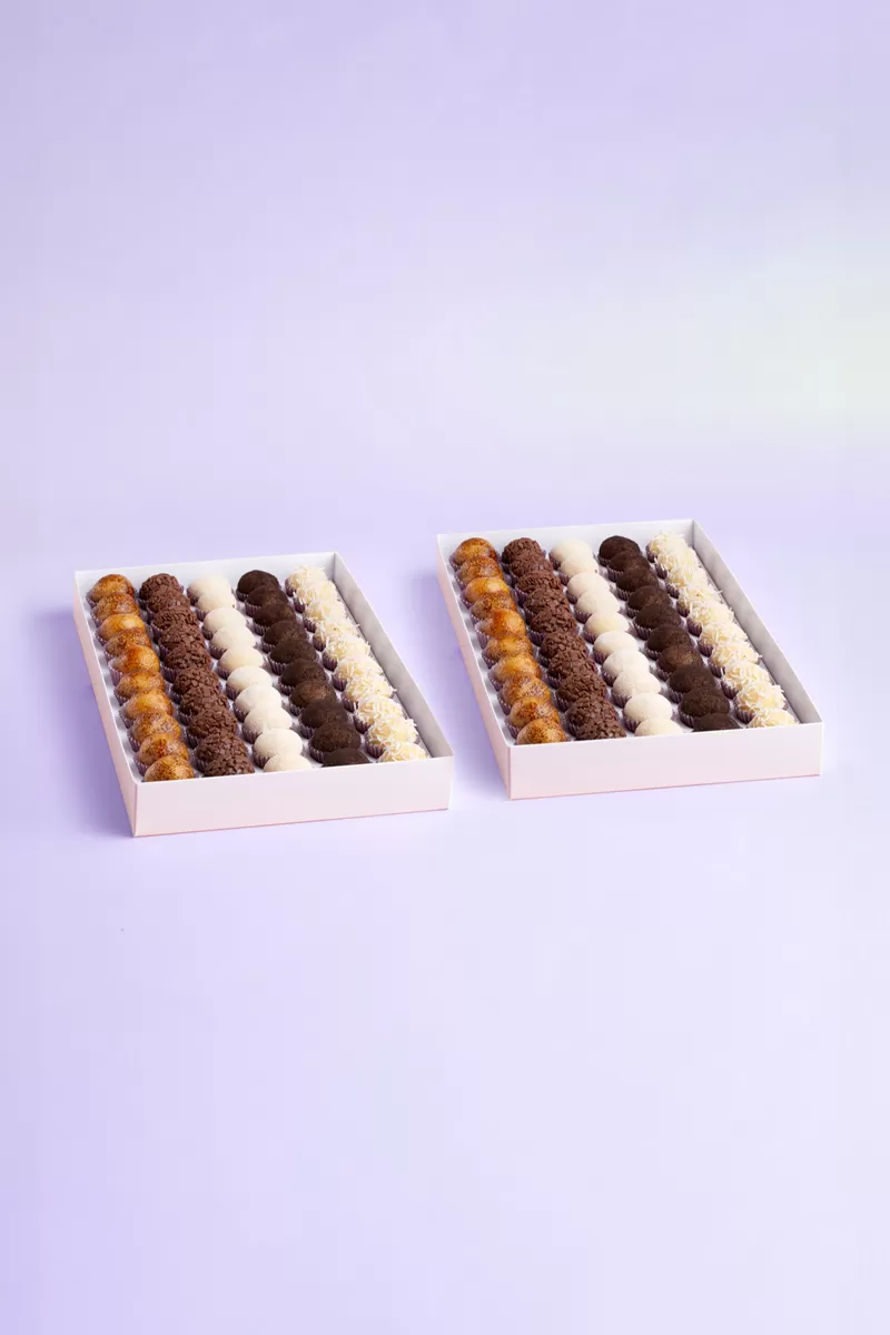 Caixa com 100 brigadeiros. Obs: Escolher até 4 sabores.